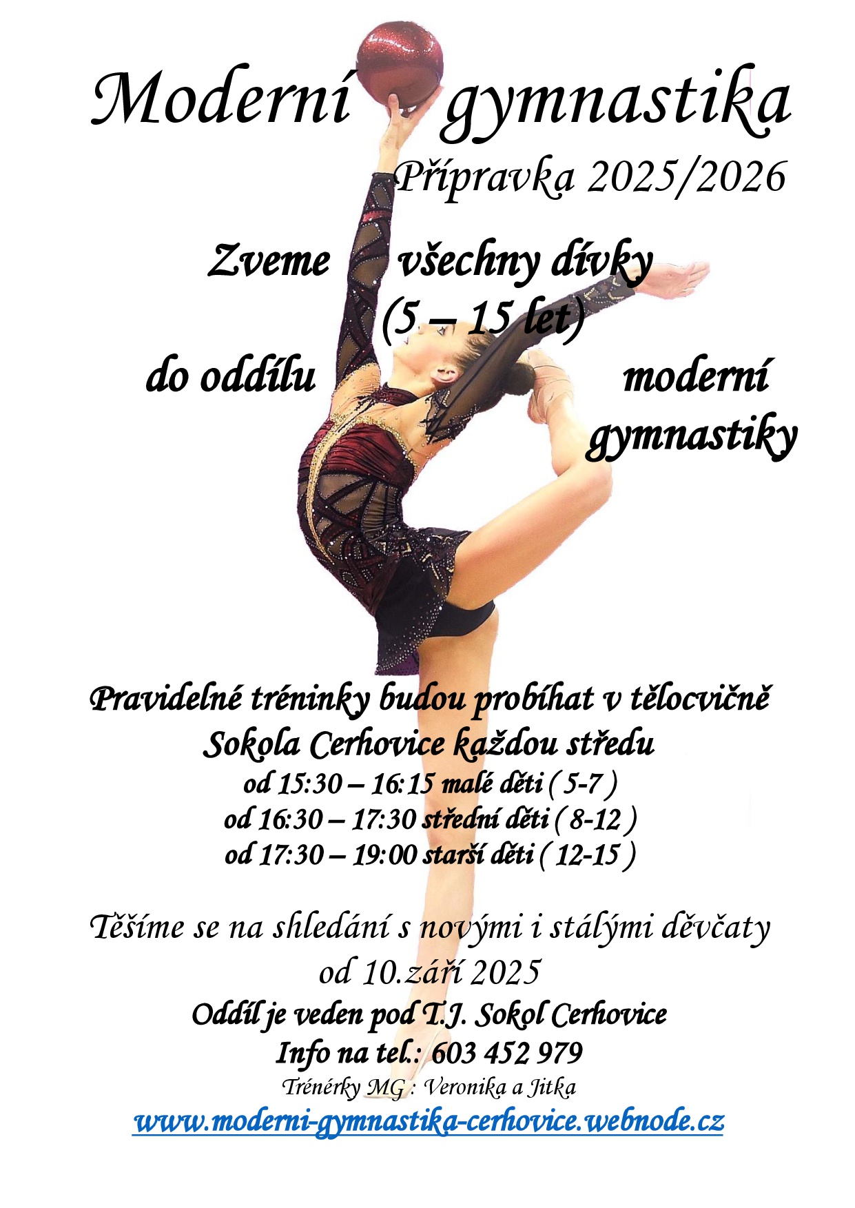 Trénujeme 1x týdně v sokolovně v Cerhovicích. Dívky se učí základní gymnastické kroky, prvky a sestavy postavené na jejich dovednostech .